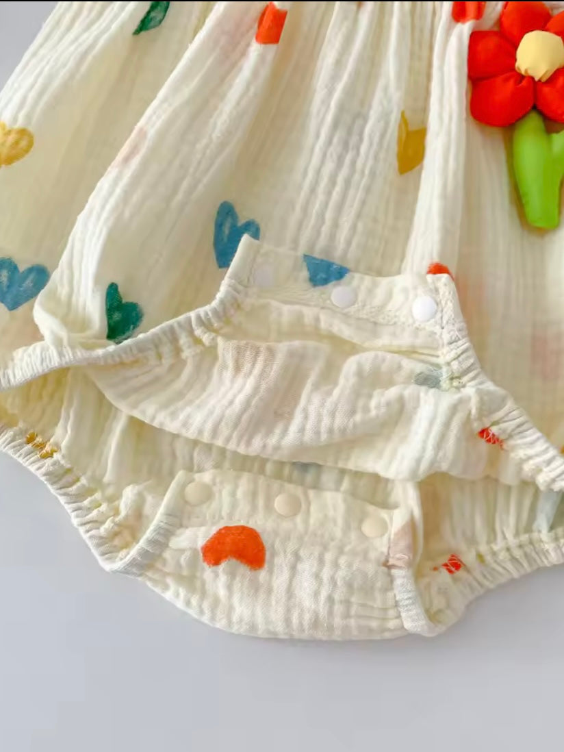 Playful and sweet, this baby girl romper set is designed for comfort and charm. Featuring soft breathable cotton with a scattered multi-color heart print, flutter ruffle straps, and elastic leg openings, it’s perfect for everyday wear or special photo moments. The matching bonnet adds the cutest finishing touch for a complete outfit.