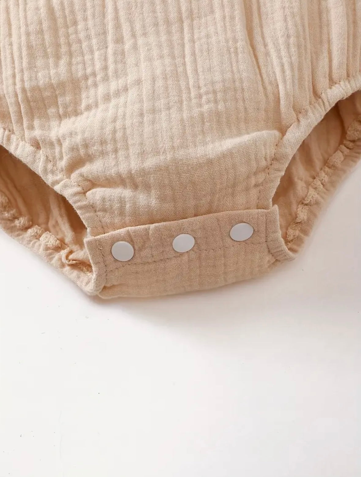 This darling romper is perfect for warm days and picture-perfect moments. Designed in a soft peachy-beige cotton, it features delicate floral embroidery across the chest and flutter sleeves for a sweet, girly touch. The lightweight, breathable fabric keeps your baby comfortable, while the back button keyhole and bottom snaps make dressing and diaper changes simple.