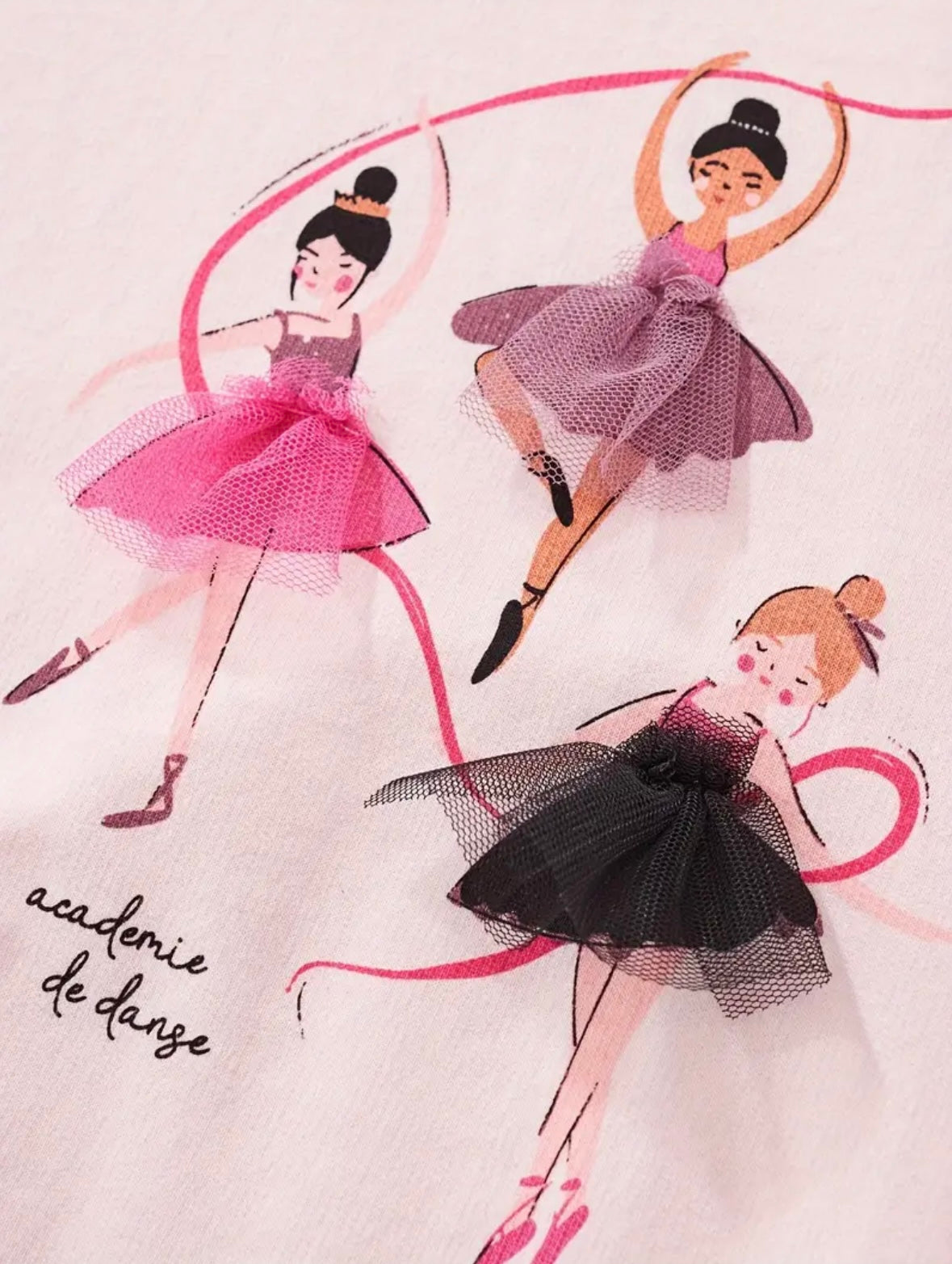 This is an adorable light pink sweatshirt featuring a printed design of three ballerinas in various poses, with their skirts made from real fabric for a 3D effect. The outfits are pink, purple, and black, each accented with matching ribbons. The text under the illustration reads “academie de danse,” giving it a chic, Parisian ballet school vibe. This sweatshirt would be perfect for a girly and stylish children’s fashion boutique like Ella’s World.