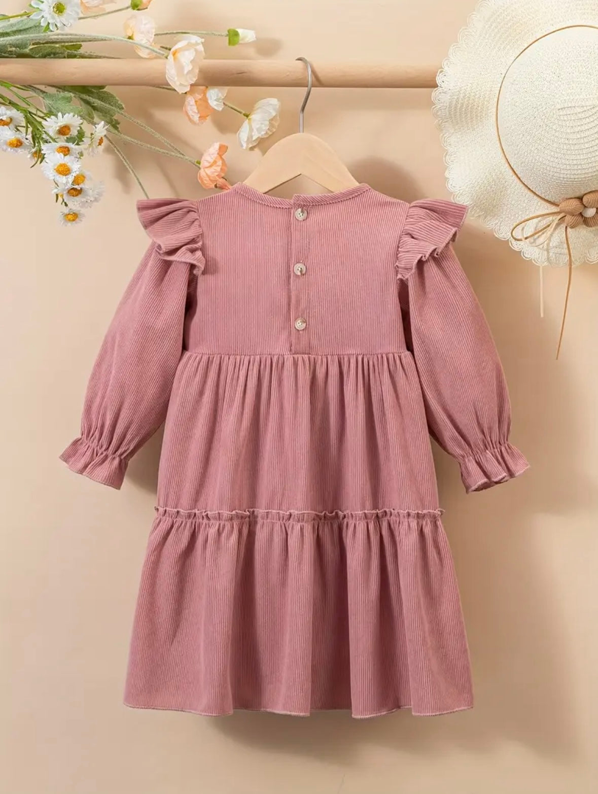 This adorable long sleeve corduroy dress is a must-have for your little girl’s wardrobe. 🌸 Featuring delicate floral embroidery on the chest, soft ruffle shoulders, and a tiered skirt, it’s both stylish and comfortable for all-day wear. The back button closure makes dressing easy, while the cozy corduroy fabric keeps her warm and chic through fall and winter.