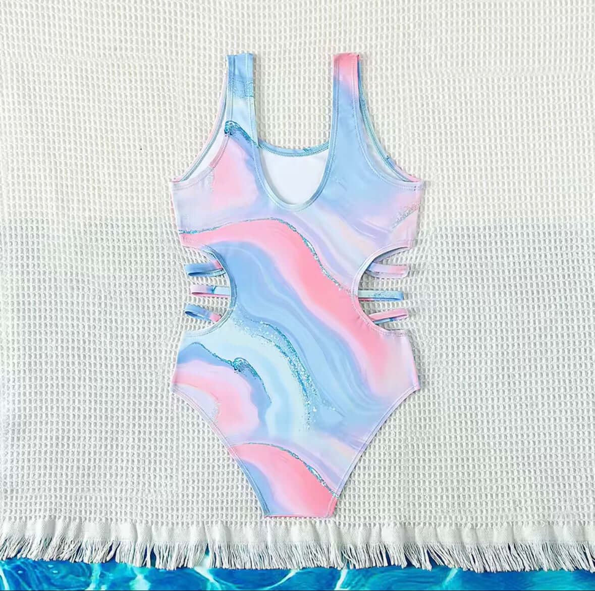 Girls’ Marble Swirl Cutout One-Piece Swimsuit – Pink & Blue