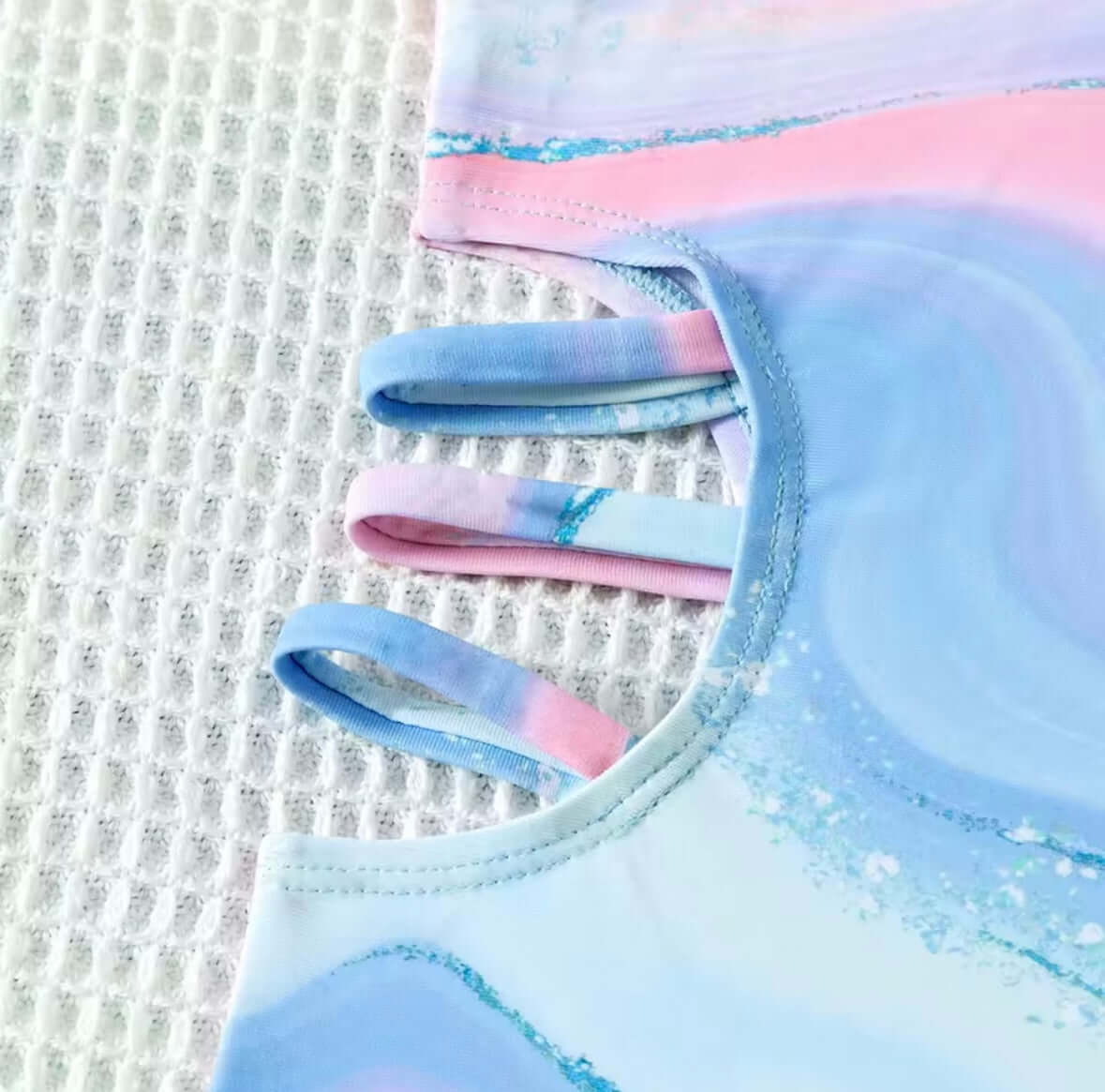 This sophisticated one-piece swimsuit showcases an elegant pink and blue marble swirl pattern complemented by strategic side cutouts with refined strap detailing. The thoughtfully designed silhouette offers both aesthetic appeal and functionality, making it an optimal selection for aquatic recreation at both swimming facilities and coastal environments.
