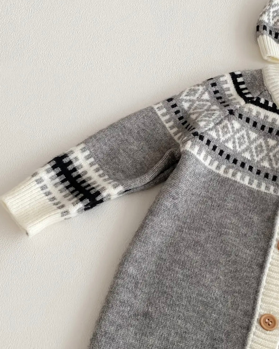 This ultra-soft knit romper features a Nordic fair-isle pattern with wood-style buttons and ribbed cuffs for extra warmth. Comes with a matching pom-pom knit hat to complete the winter-wonderland look!