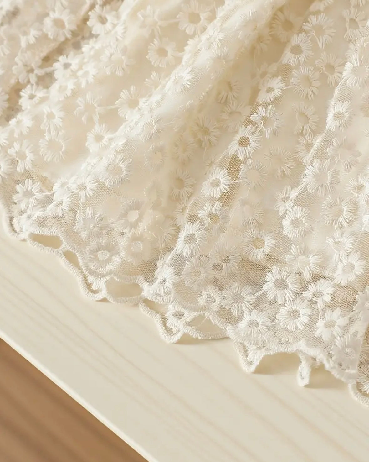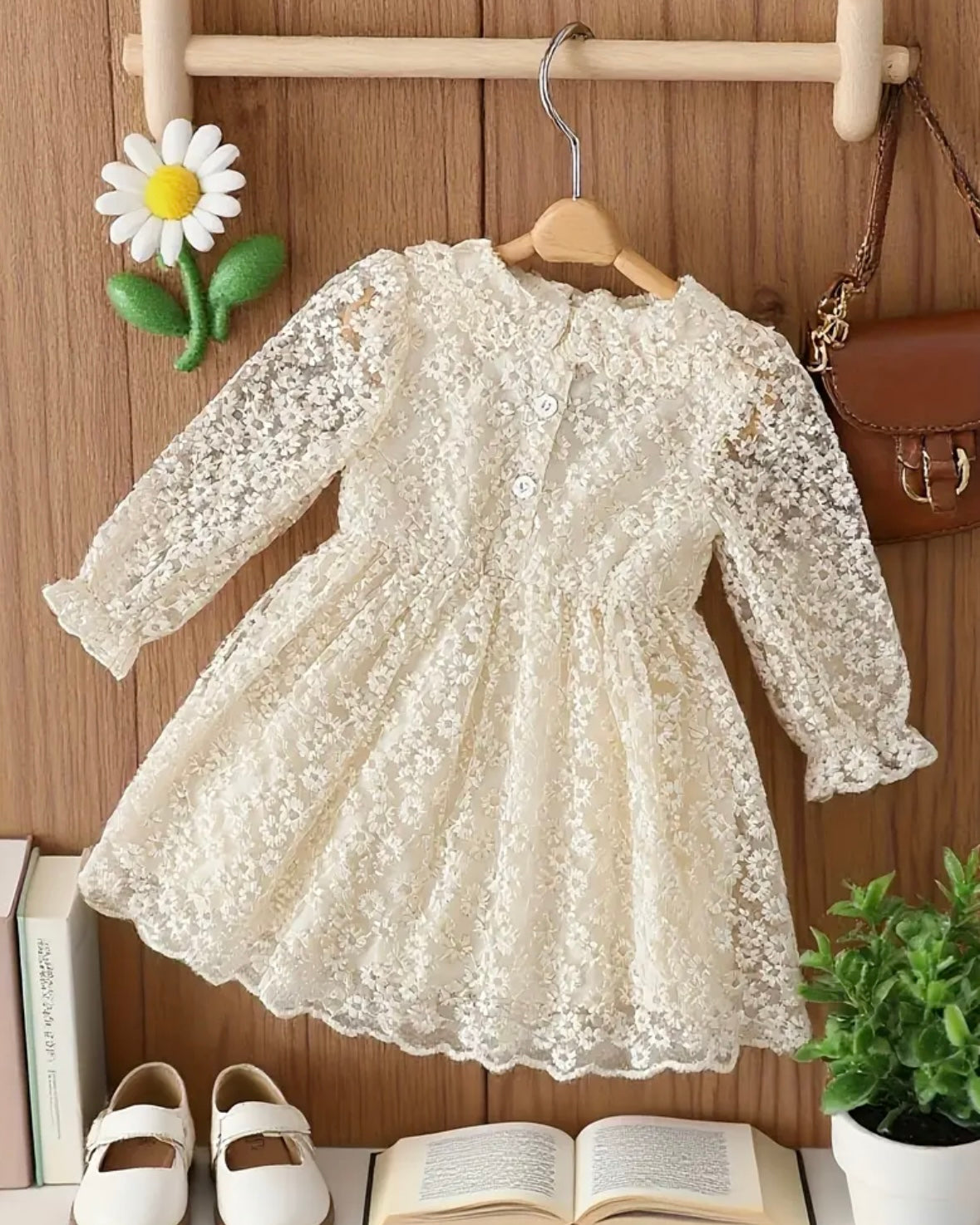 A dreamy vintage-inspired lace dress designed for your little one’s sweetest moments. This elegant piece features delicate floral embroidery, long lace sleeves, and a dainty scalloped hem — perfect for birthdays, family photos, holidays, or any occasion that calls for something truly special.