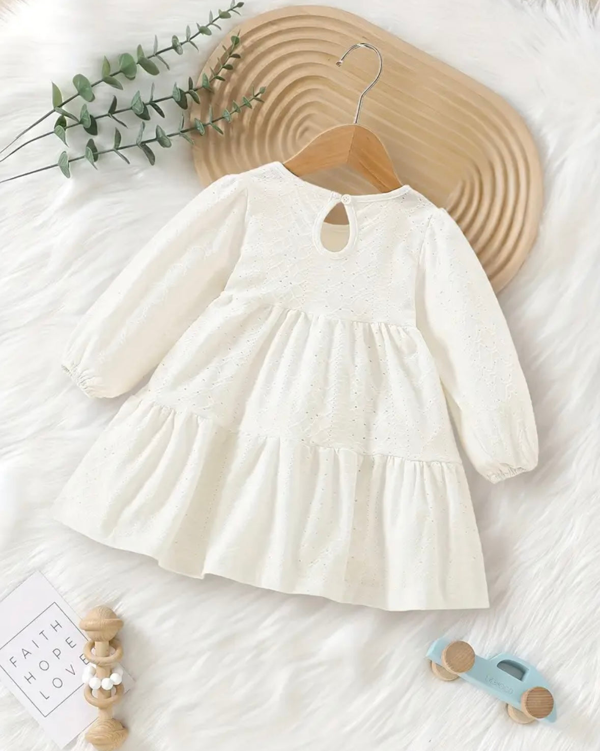 White Long Sleeve Baby Dress – Soft Cotton Eyelet Outfit, Size 6–9 Months