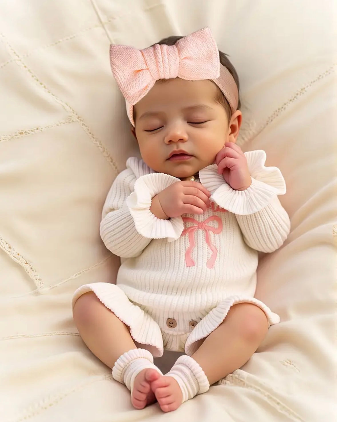 🤍 Newborn “She’s Here” Knit Romper with Bow Headband – Size Newborn