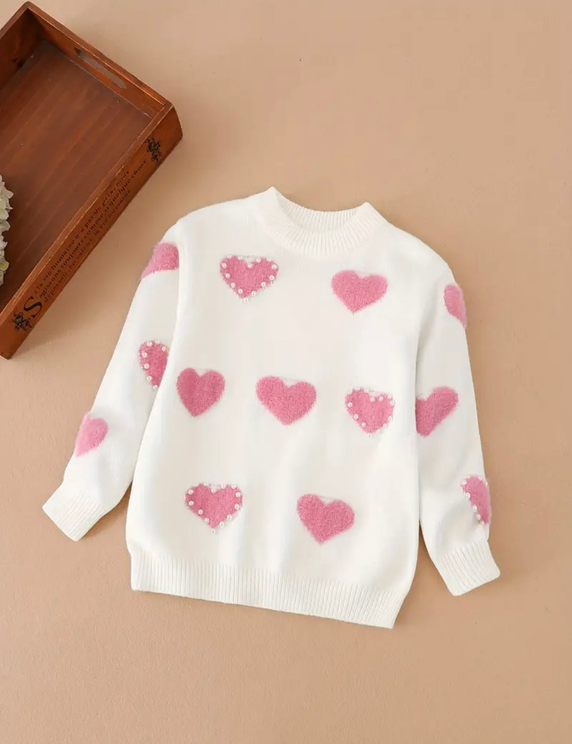 Pearl Heart Sweater – White Knit with Fuzzy Pink Hearts