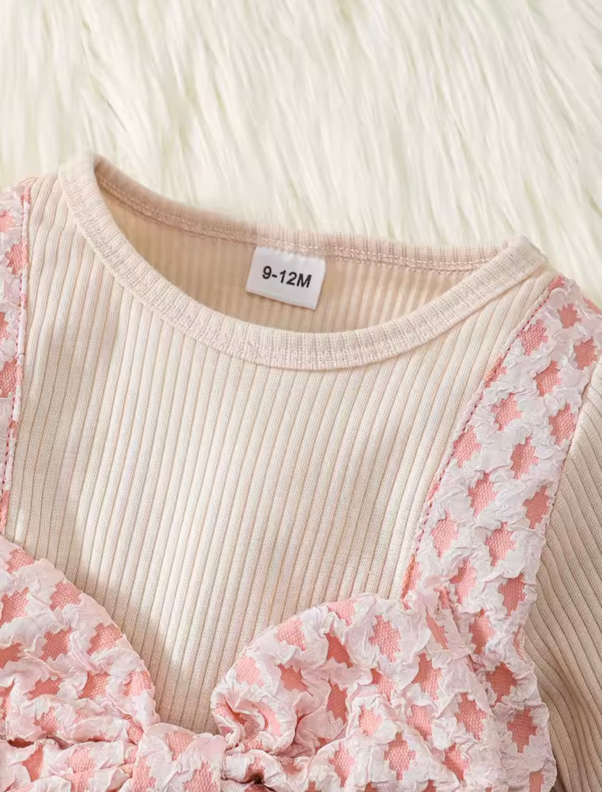 Featuring a cozy ribbed cream long-sleeve top and an irresistible pink tweed suspender dress with a big bow detail — this outfit is perfect for special moments, photoshoots, or simply twirling in style. Comes with a matching headband to complete the look!