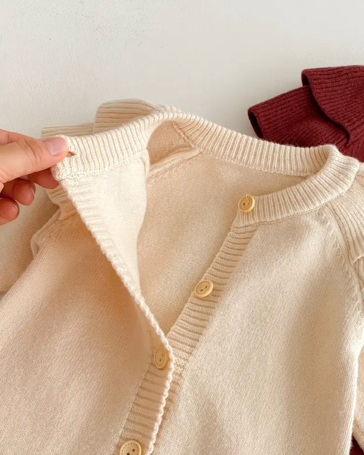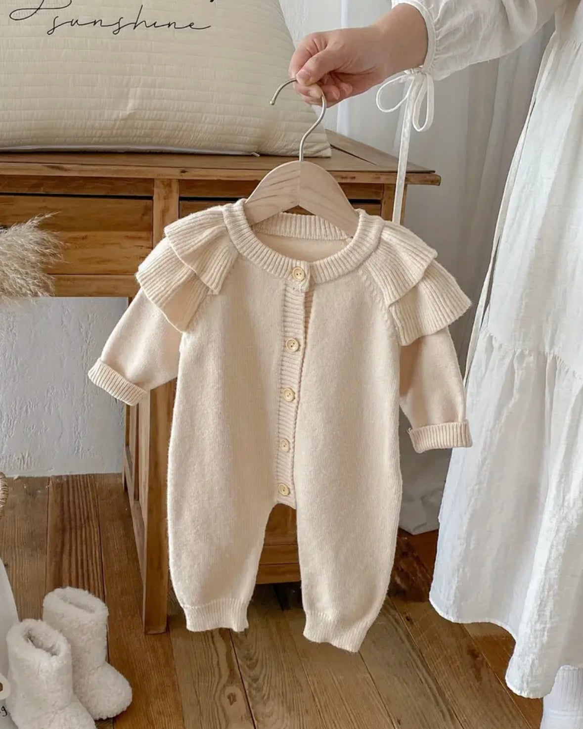 This luxury knitted romper features delicate ruffle shoulders, wooden button details, and a cozy neutral beige tone that pairs beautifully with any accessory. Designed with comfort and style in mind, it’s perfect for family photos, holidays, or everyday cuddles.