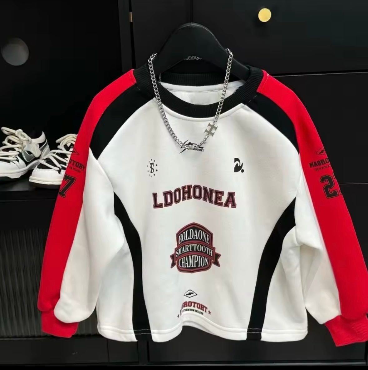 👕 Top: Racing-style sweatshirt with red + black contrast sleeves, bold varsity graphics, and a relaxed oversized fit.