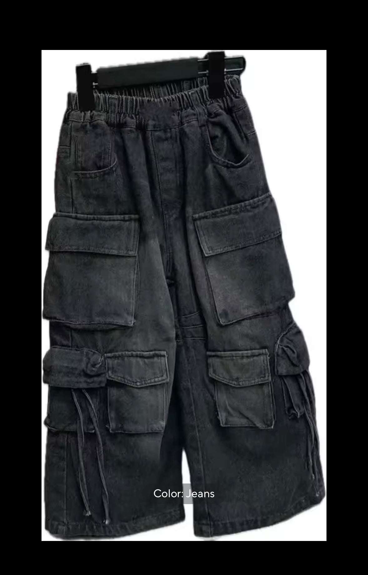 👖 Bottoms: Washed black cargo jeans with oversized utility pockets and drawstring details for a true streetwear edge.