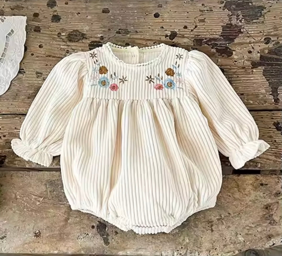 Wrap your little one in cozy charm with this premium-quality baby romper. Made from soft corduroy with subtle pinstripes, it features delicate floral embroidery across the chest for a sweet vintage touch. Long puff sleeves with elastic cuffs and practical bottom snaps make it both stylish and functional. Perfect for everyday wear, photoshoots, or special occasions.