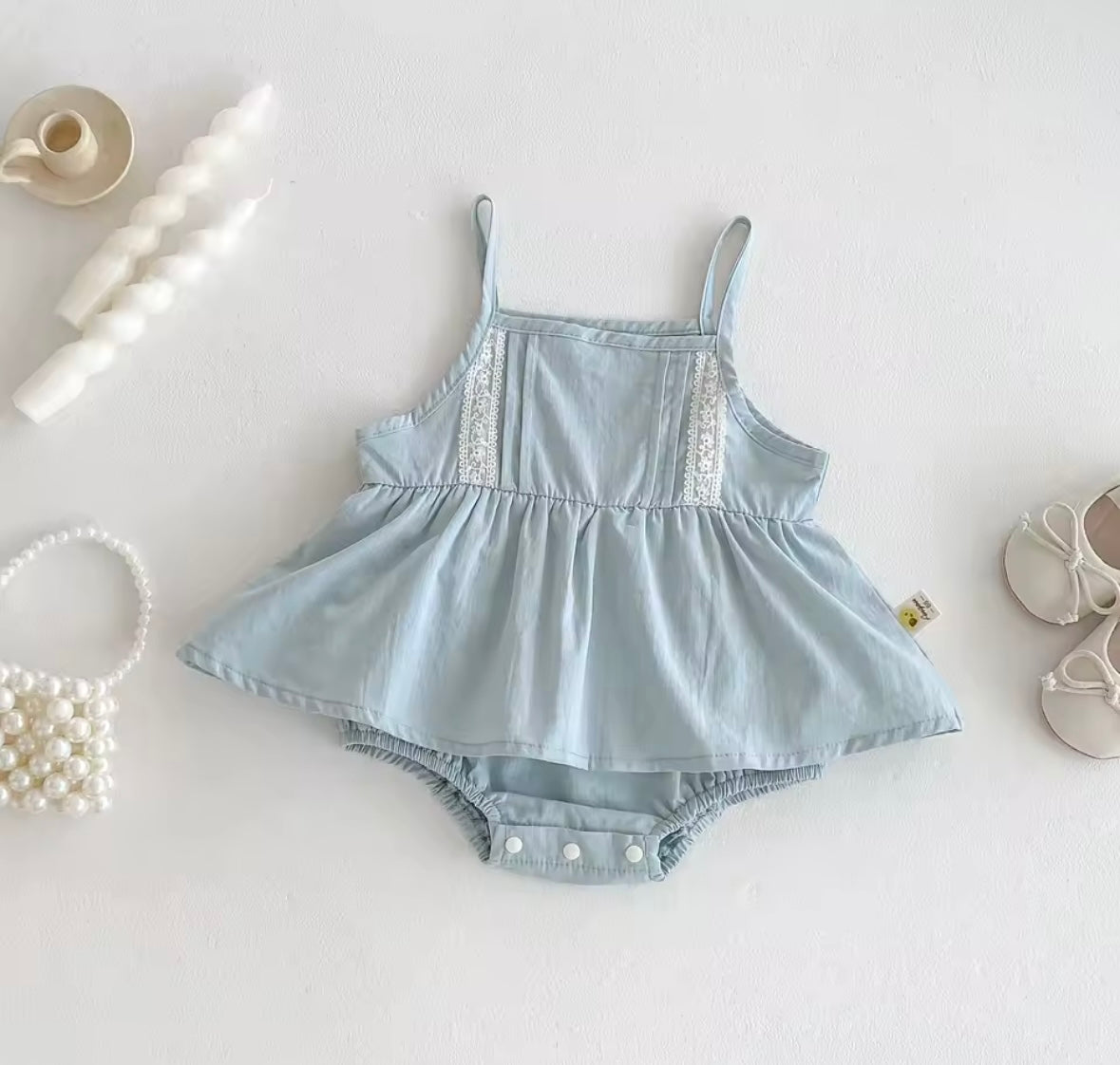 Soft, airy, and oh-so-adorable — this pastel blue romper is designed for the sweetest little moments. Featuring dainty shoulder straps, a lightly flared skirt overlay, and subtle white lace trim, it’s perfect for sunny days, family outings, or photoshoots. Crafted from breathable cotton, it includes snap closures at the bottom for easy changing. Enhanced with natural touches like tiny purple and white flowers and a soft, feminine aesthetic, this piece belongs in every baby girl’s wardrobe.