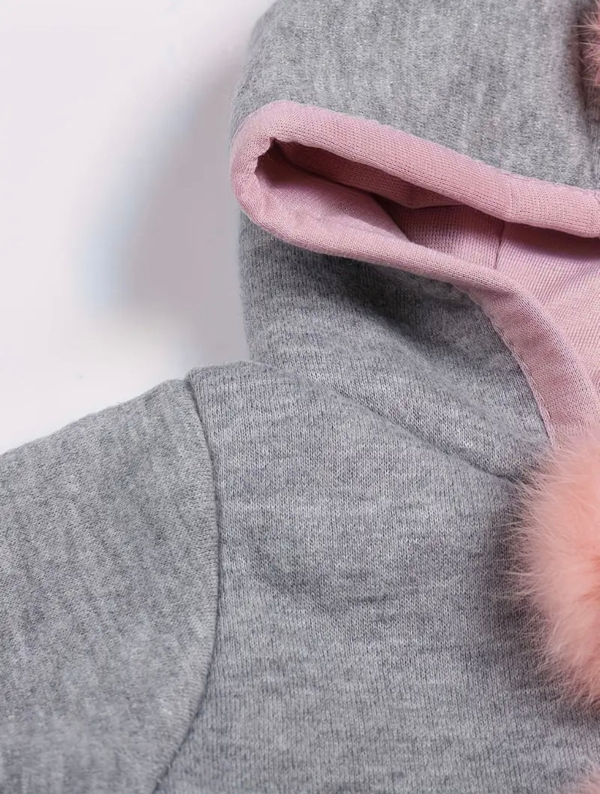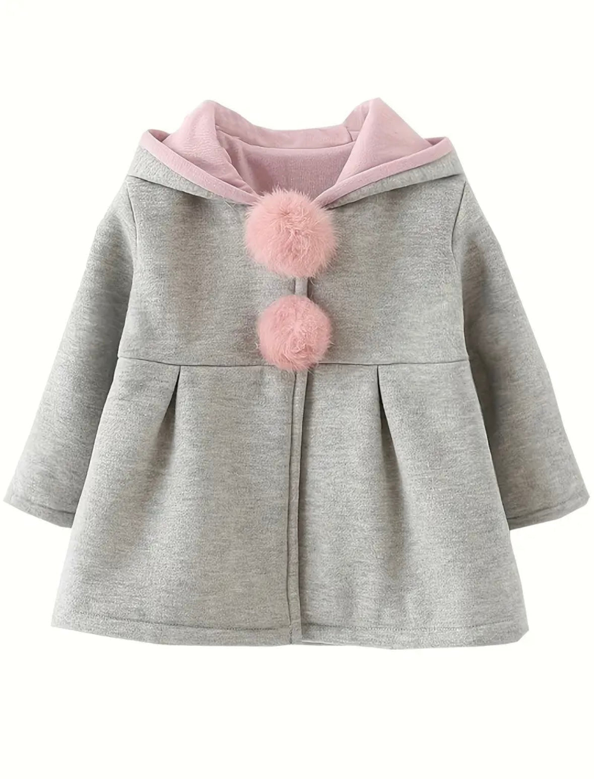 Ultra-Soft Girls’ Hooded Coat with Pink Pom Poms – Size 4–5Y