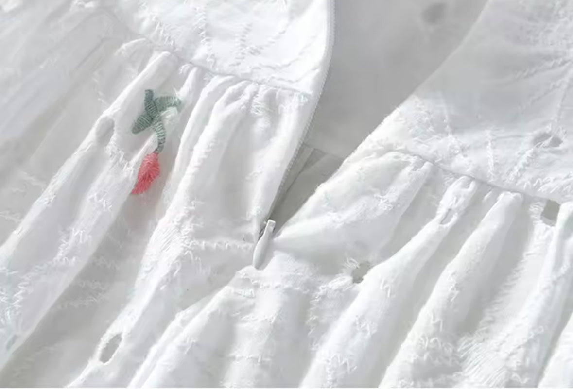 This adorable white girl dress features delicate eyelet embroidery, soft rosebud floral prints, and a sweet gathered skirt that twirls with every step. Made from breathable cotton, it’s perfect for warm summer days, garden parties, birthdays, or everyday elegance.